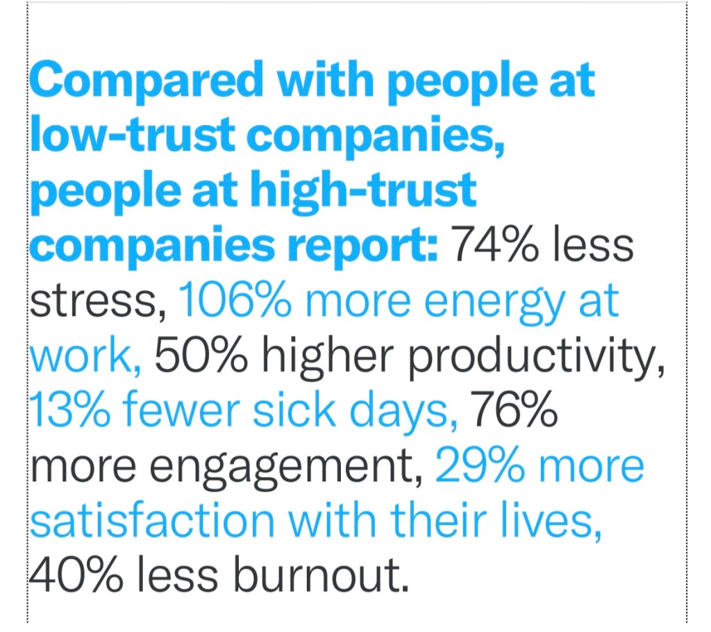 Trust seems to be the essence for success in modern organisations. Especially for agile organisations or the ones that are on their way of becoming one. The article in HBR “The Neuroscience of trust” made that very clear by showing some numbers.