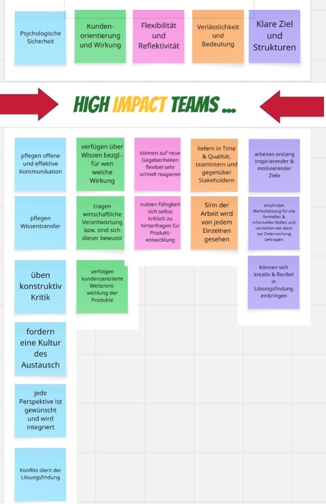 Hohes Maß an Psychologischer Sicherheit, Kundenorientierung und Wirkung, Flexibilität und Reflektivität, Verlässlichkeit und Bedeutung und letztlich an klaren Zielen und Strukturen.